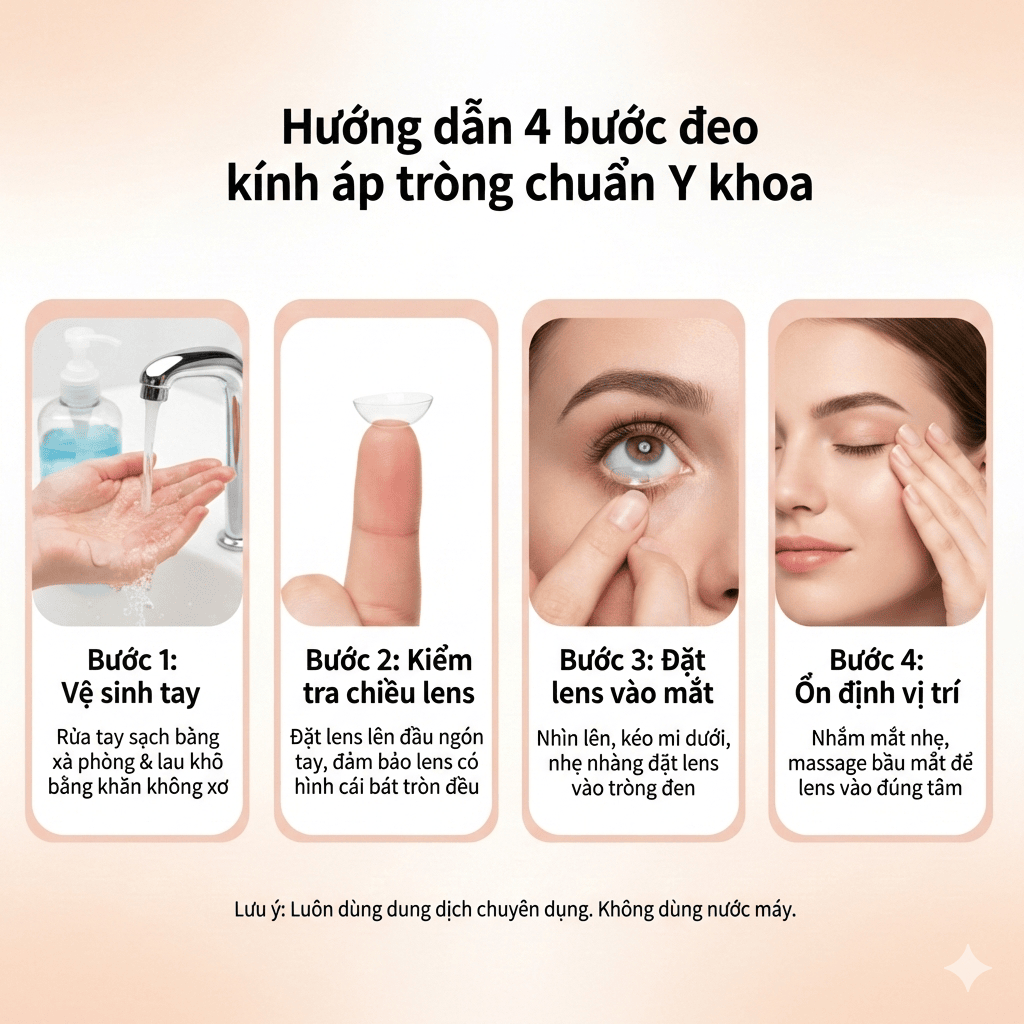 3: Đeo lens bị cộm phải làm sao? Tháo lens ra ngay lập tức. Kiểm tra xem lens có bị rách, dính bụi hay bị đeo ngược mặt không. Rửa sạch lại bằng nước ngâm và thử lại. Nếu vẫn cộm, có thể mắt bạn đang bị viêm hoặc kích thước lens không phù hợp (BC không khớp). |