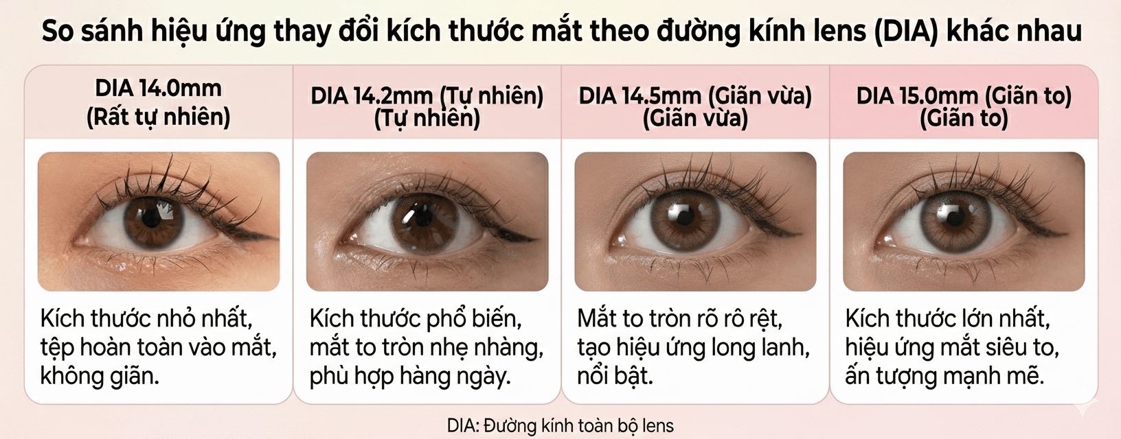 - Nếu muốn mắt to hơn (hiệu ứng giãn tròng), bạn có thể chọn DIA 14.5mm hoặc 14.8mm. Tuy nhiên, nếu mắt bạn nhỏ mà chọn DIA quá lớn, mắt sẽ trông "giả", lòng trắng bị che lấp hết và gây cảm giác cộm.