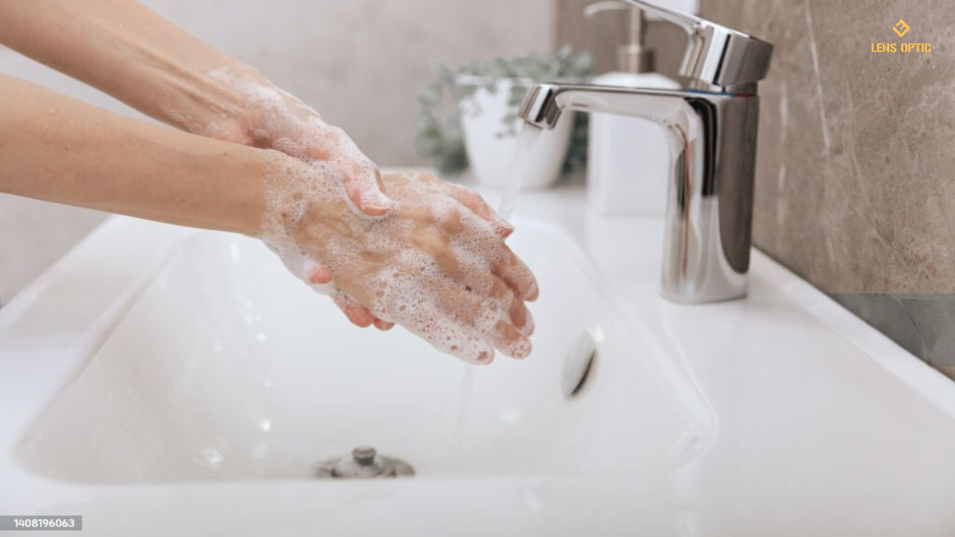 Trước khi tiếp xúc với lens, bạn cần chuẩn bị kỹ lưỡng để đảm bảo an toàn cho mắt khi đeo lens. Việc rửa tay thật sạch sẽ bằng xà phòng và lau khô là bước quan trọng đầu tiên để loại bỏ vi khuẩn. Vì tay chúng ta có rất nhiều vi khuẩn trú ngụ, nên cần loại bỏ chúng trước.