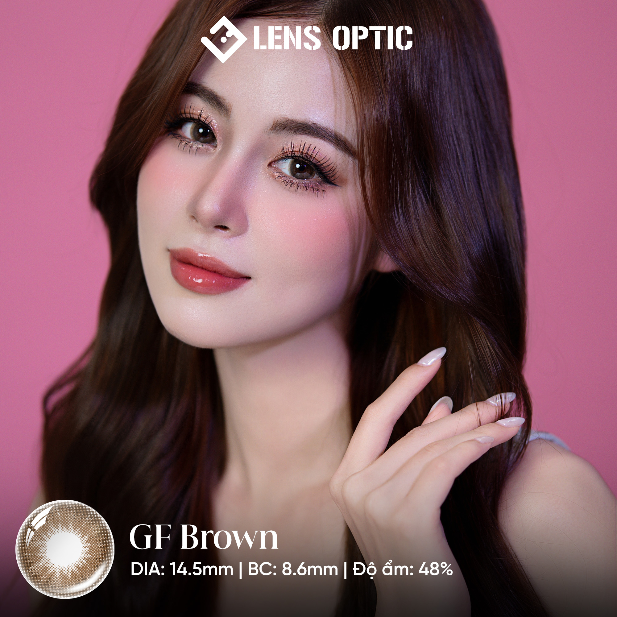 Khác với các dòng lens dùng 1 lần, GF Brown là dòng kính áp tròng dài hạn (Hạn sử dụng lên đến 6 tháng). Sản phẩm được thiết kế với đường kính (DIA) tiêu chuẩn 14.2mm. Đây là kích thước "tỷ lệ vàng" cho mắt người Châu Á, giúp tạo hiệu ứng giãn tròng nhẹ nhàng, giúp mắt trông to hơn, có chiều sâu hơn nhưng tuyệt đối không gây cảm giác giả hay quá "búp bê" (Dolly eyes).