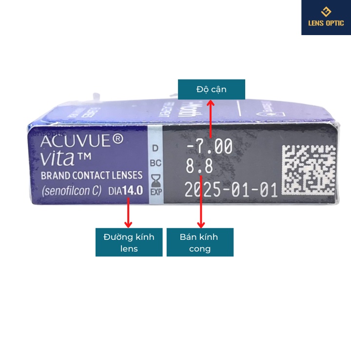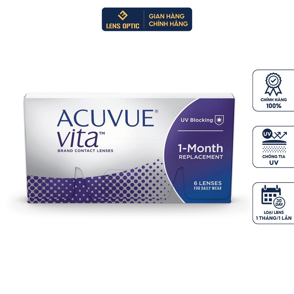 | 2. Acuvue Vita có đeo đi ngủ được không? | Mặc dù chất liệu Silicone Hydrogel cho phép thẩm thấu oxy tốt, nhưng Acuvue Vita được chỉ định là lens đeo ban ngày (Daily Wear). Bạn KHÔNG NÊN đeo qua đêm để tránh nguy cơ viêm nhiễm giác mạc. |