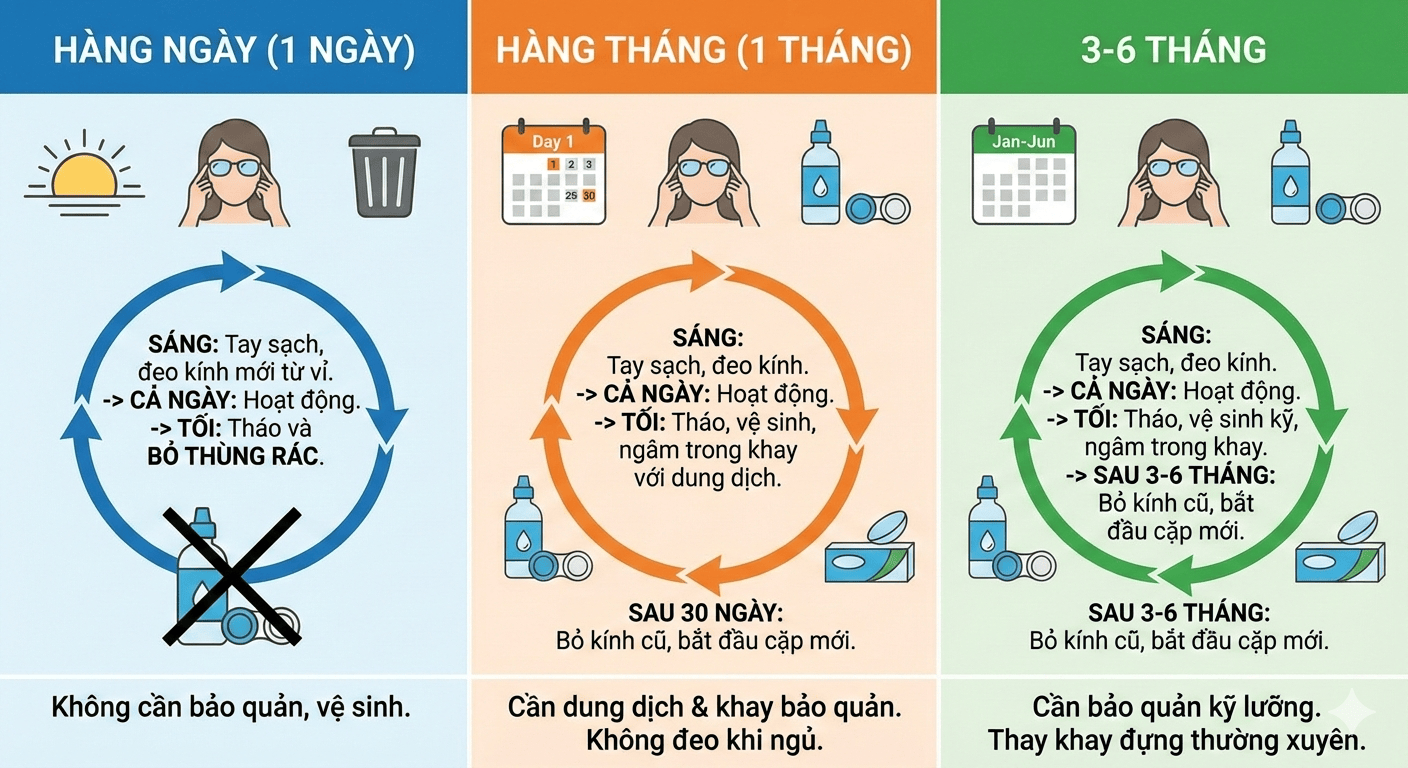 - Tuân thủ thời gian thay: Dù là 2 tuần hay 1 tháng, phải thay mới đúng hạn để tránh nhiễm trùng mắt.